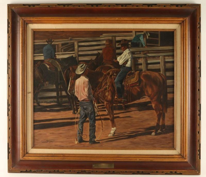 "Rodeo Talk" measures 23"x19" in beveled wood frame with linen insert.