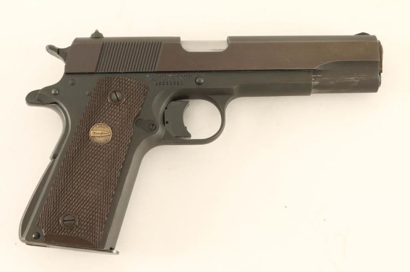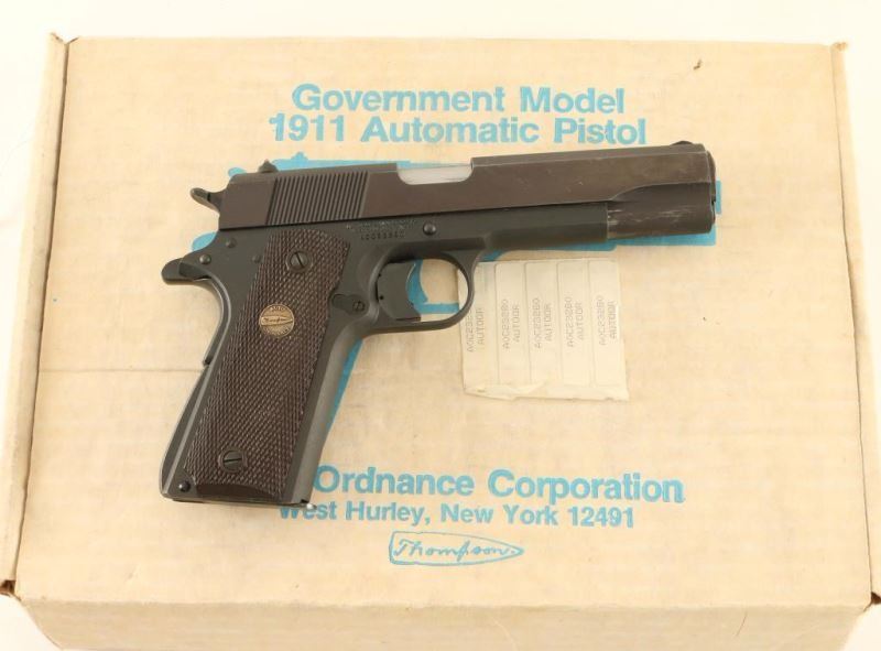 American made single action semi automatic pistol. Features a blue finish, 5" barrel, low profile blade front sight, square notched rear window sight, serrated adjustable trigger, steel frame, 7 round magazine, thumb safety, beaver tail grip safety, knurled wide hammer spur, serrated arched mainspring housing, and 2 piece checkered brown plastic grips with AO medallions. Includes the original factory cardboard box with documents and tool. Pistol exhibits approximately 97% of its original blued finish with some light wear on the underside of the slide. Action is strong, bore is very good+, and plastic grips are fine. Condition is excellent in box. ***Modern Firearm***