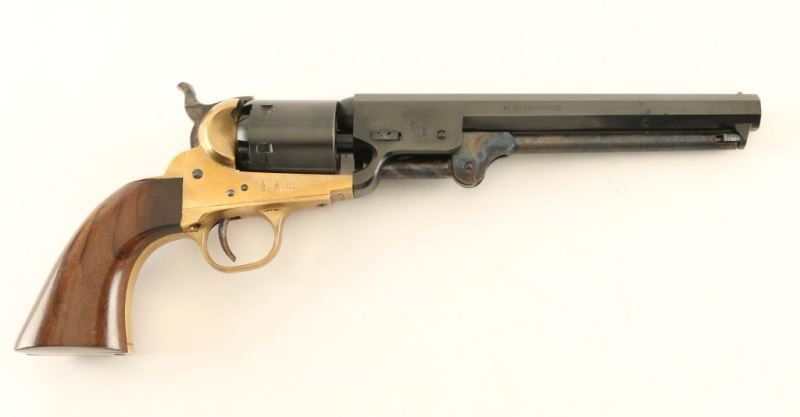 Italian made percussion revolver, circa 1972. Blued 7.5" octagon bbl, brass frame & backstrap, non-fluted six-shot cylinder, case colored trigger & hammer and one piece walnut grip. 96% finish intact showing light edge wear and some light tooling marks around the barrel wedge. Action is crisp, bore is clear and wood stock is very good. Condition is excellent. ***Antique Firearm***
