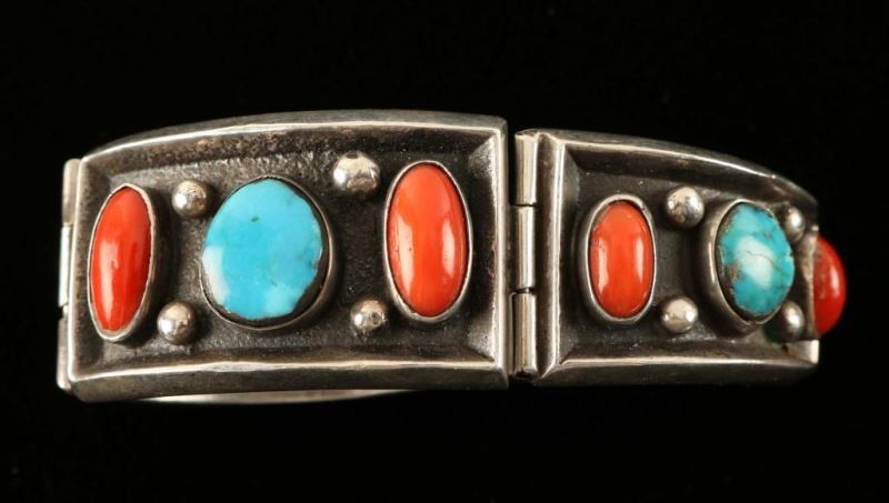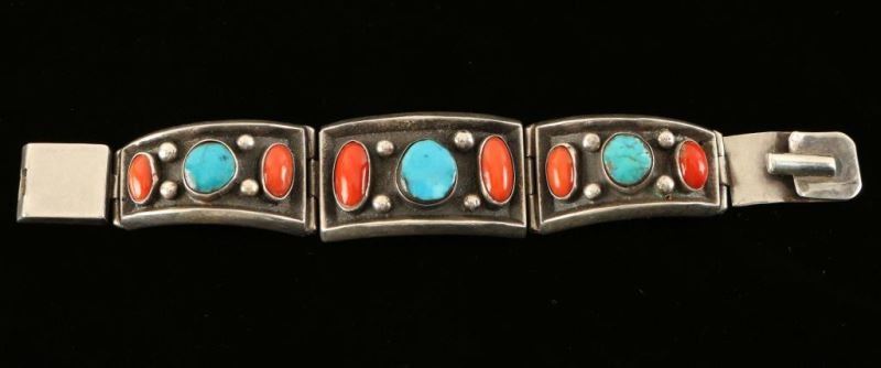 Two coral ovals sit in a heavy gauge sterling panel on either side of a round turquoise stone with silver bead accents. There are Three panels total that make up the bracelet, making nine stones total. Push lever open. Unsigned. Measures 1"w x 6"l. Very striking.