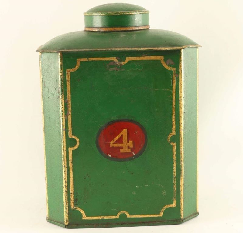 Green octagon tin with round domed lid and gold trim . A gold number "4" sits inside a red in black circle on the front. Measures approx. 10 1/2"l x 7 3/4"w x 14"h. Shows some small loss to paint and rust otherwise very good. Perfect for display.