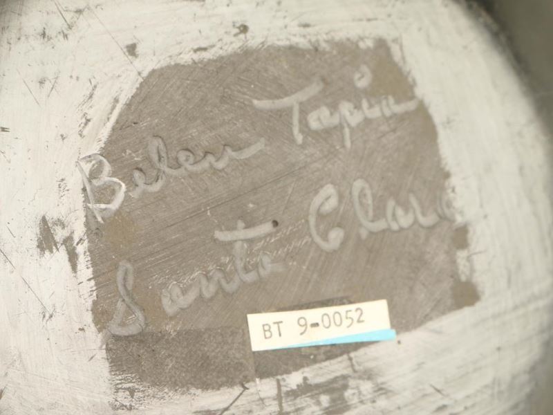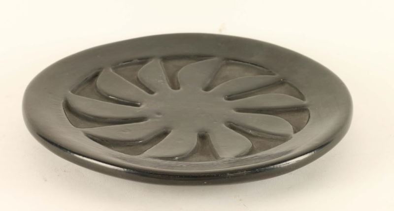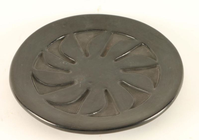 This vintage Santa Clara Incised Blackware Plate is a very nice collectible that was offered at auction by the Phoenix Heard Museum. Made by Belen Tapia, circa 1950-1960's, this was hand built & stone polished to produce the high shine against the matte clay in a sun or flower design. One of a kind, it measures 8-3/4" wide. In very good condition, the base is signed. This Santa Clara Incised Blackware Plate is outstanding! Belen Tapia (1914-1999) was a niece of Serafina Tafoya and first cousin of Margaret Tafoya & her grandmother was Nestoria Naranjo. She started to work clay in 1935 & was an innovator of polychrome redware. She is referenced in Barry's "American Indian Pottery", Schaaf's "Pueblo Indian Pottery, 750 Artist Biographies" & Trimble's "Talking with the Clay, The Art of Pueblo Pottery in the 21st Century" & many others.