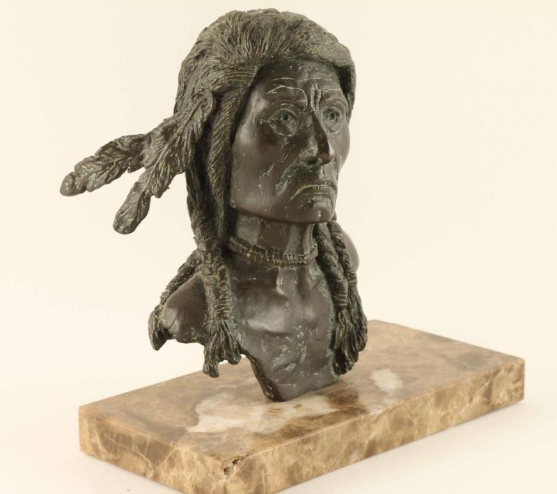Bust of Indian brave with two feathers in his hair with somber expression on marble base. Signed 'Baldwin 78' on back. Measures 7"x7"x4". Small chip on front of base corner.