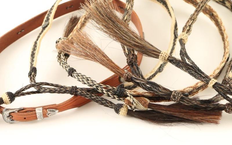 4 Horsehair Bands In Earth Tones And 1 Smooth Saddle Brown Leather With Silver Metal Conchos And Buckle.