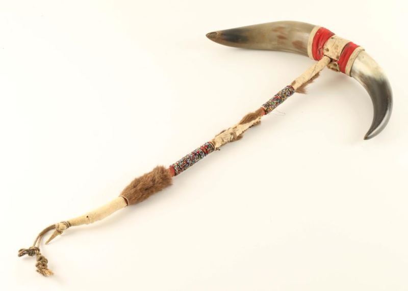 Hide and fabric wrapped handle accented with colorful trade beads. Shows two buffalo horns at ends. Measures 22"h x 12'w.
