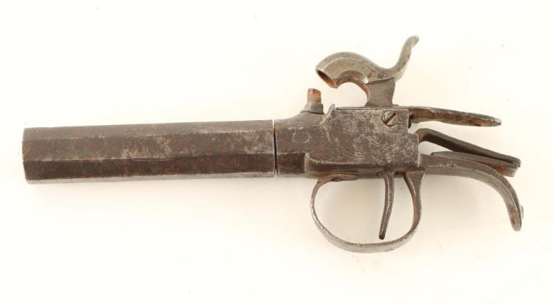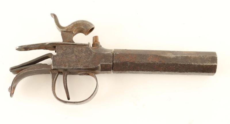 Center hammer, circa 1850's with an approximate .40 caliber bore. 3" barrel, floral scroll engraved receiver, smooth trigger & hammer spur and no stock. Pistol exhibits a dark patina with raised dark rust. Action performs well and bore is good. Condition is good. ***Antique Firearm***