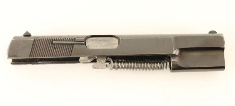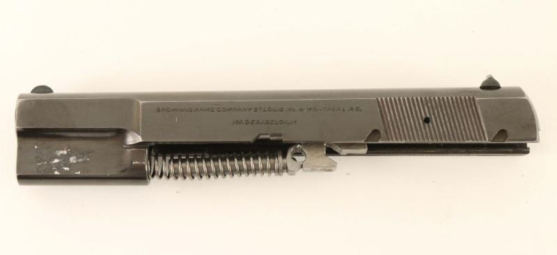 Complete Belgium made slide w/ barrel, recoil spring, sights, extractor, firing pin, ect. Barrel & slide are unserialized w/ Belgium proofs. Approximately 93% finish intact showing light edge wear, scratches, some and what appear to be dried grease on the top of the slide between the rear sight & the ejection port. Bore is very good++. Condition is very good+++.