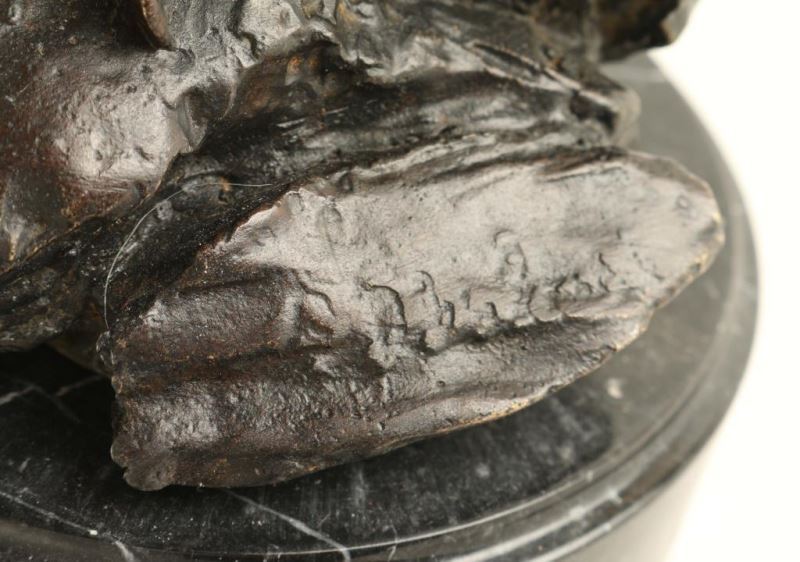 Eagle with outstretched wings sits on a black marble base. Signed by artist on base. Measures approx. 9 1/2"l x 12"h x 6"w.