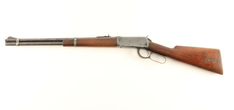 Vintage lever action repeating rifle, circa 1943-1944. Blued finish, 20" barrel, full-length tube magazine, ramped blade front sight. adjustable rear sporting sight, two barrel bands, serrated metal buttplate and smooth walnut stocks. Rifle exhibits approximately 60% of it's blued finish showing wear and scattered rust on the barrel & magazine tube(primarily on the left side). Action is crisp, bore is excellent and wood stocks are good+ w/ a crack in the forend forward of the barrel band on the left side. Condition is near good. ***C&R Firearm***