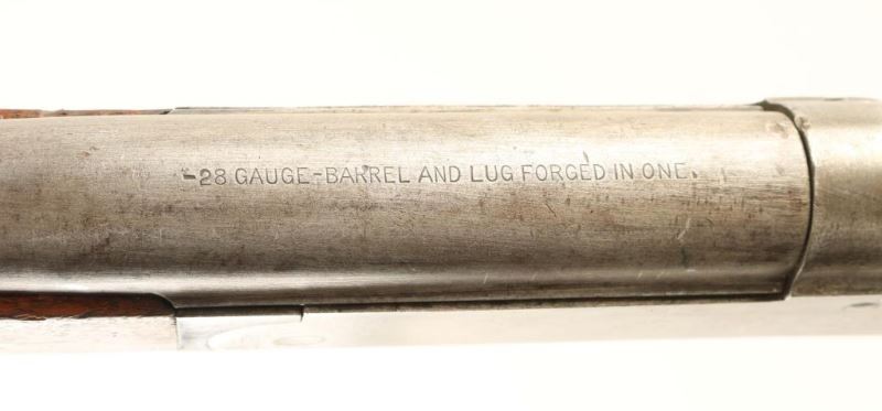 CHAMPION SINGLE BARREL 28 Ga 30” barrel (barrel and lug forged into one piece). Manufactured C. 1923; rebounding center mounted hammer, top lever operated break open design, full choke, American black walnut stock and forend. Overall fair condition, the stock and forearm have nicks, dings and scratches. Stock exhibits several cracks near the wrist, stock is missing the buttplate. The barrel, receiver, and metal parts show little original finish remaining. *Modern Firearm*