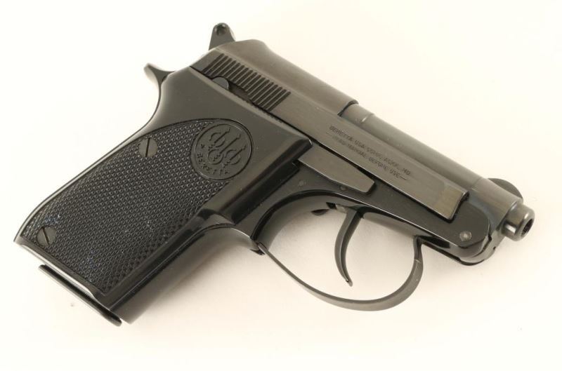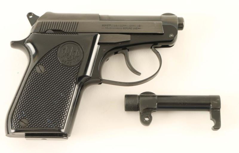 American made double-action semi automatic pocket pistol chambered in .22 Long Rifle. Features a blued/black finish, 2.5" tip-up barrel, fixed sights, smooth trigger, serrated round hammer spur, thumb safety, push button magazine release, 8 round magazine and two-piece checkered black plastic grips with Beretta insignias. Includes a factory cardboard box with manual and spare threaded barrel . Pistol exhibits approximately 96% of it's original finish showing some handling marks/scuffs and a few minor losses. Action is tight, bore is very good and grips are near fine. Condition is near excellent in box. ***Modern Firearm***