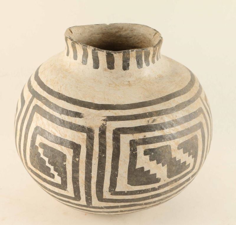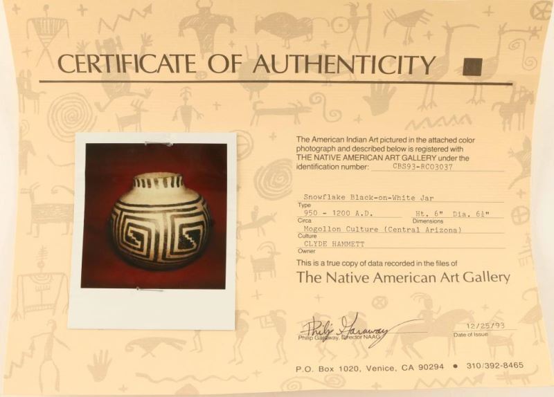 Snowflake black on white jar, 950-1200 A.D. 6"X6 1/2". includes certificate of Authenticity from the Native American Art Gallery Venice, CA.