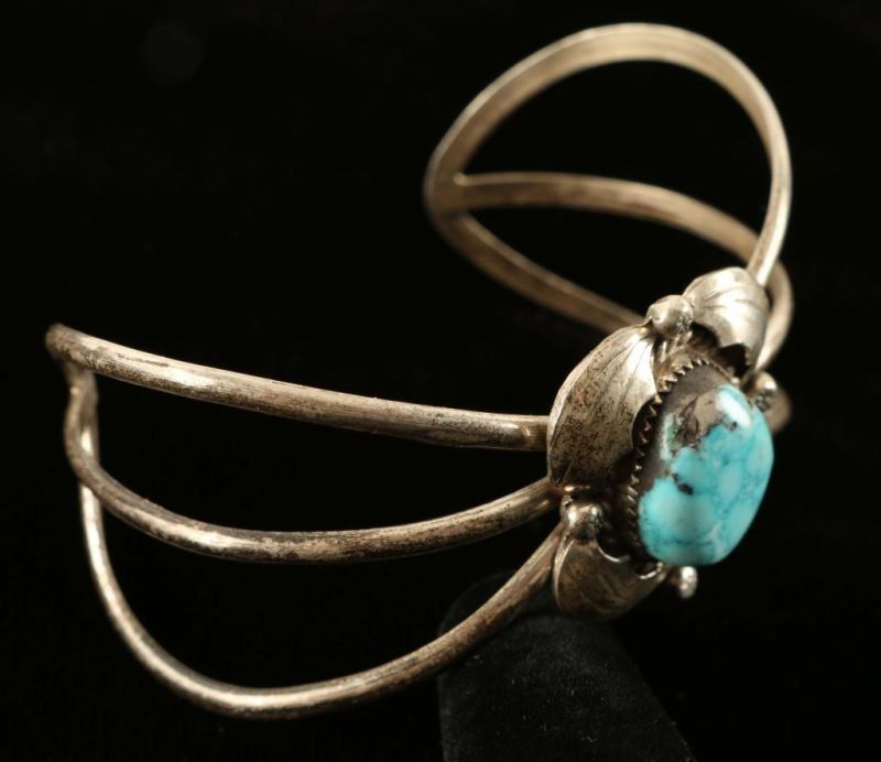 Turquoise cab sits in the middle of a sterling leaf and rope design which is held by three separate outstretched bands of hammered silver. Signed but unreadable. Measures 1 1/8" at widest, 5 1/2"l plus 1 1/2" gap. Truly unique.