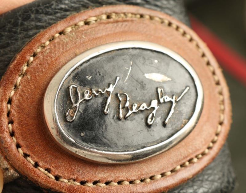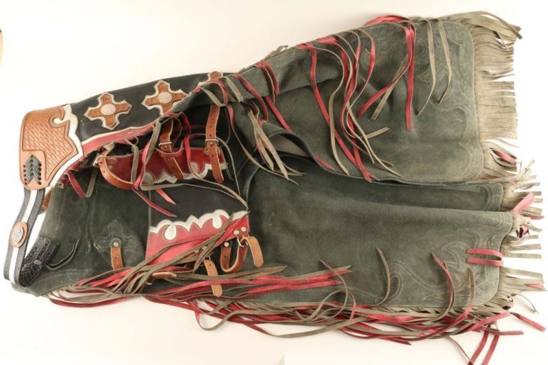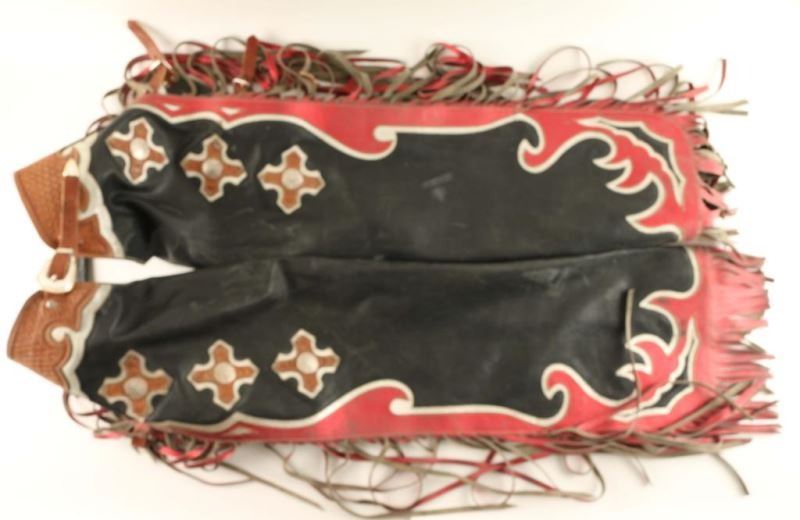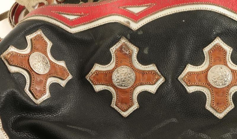 Black leather with silver, metallic red and tan leather accents. Tan and silver with silver metal conchos up and down each side of red fringed edge. Tan basket weave top with fancy scrolled silver and gold metal buckle, keeper and tip on belt. Measure 40" long. Shows some wear.