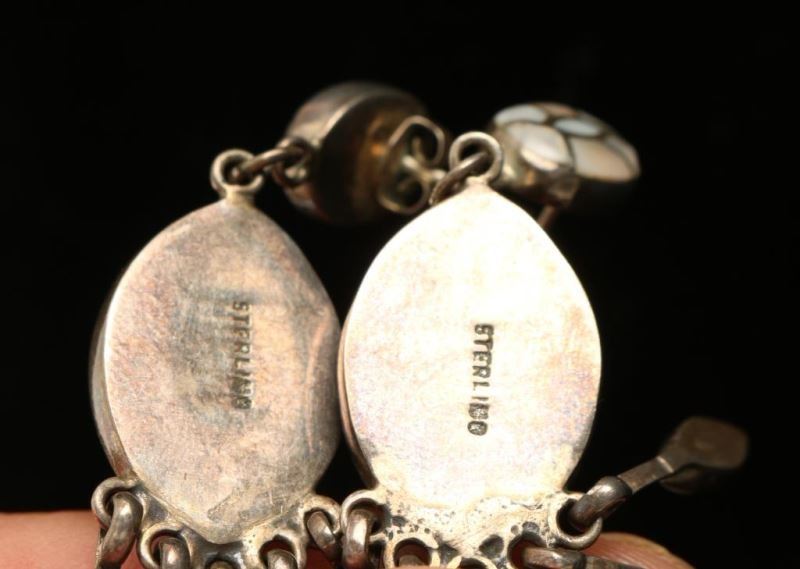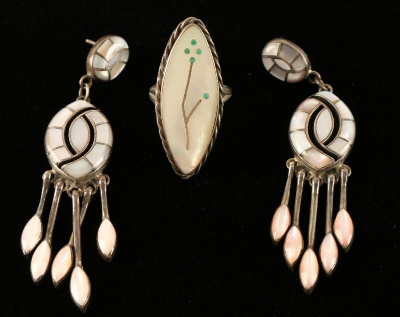 Sterling silver ring with a large pointed oval that has a floral design. Earrings have two inlaid oval drops with five dangles. Marked 'Sterling' on the back.