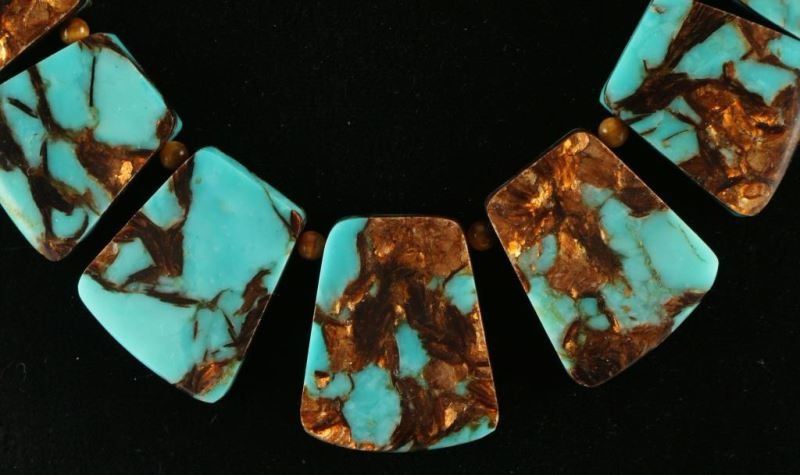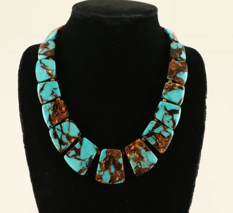 Turquoise infused with Bronzeite, Tiger's Eye beads, and Sterling. 21st century by Navajo Sharon Joe. Measures 20" long. Adjustable with lobster claw closure.