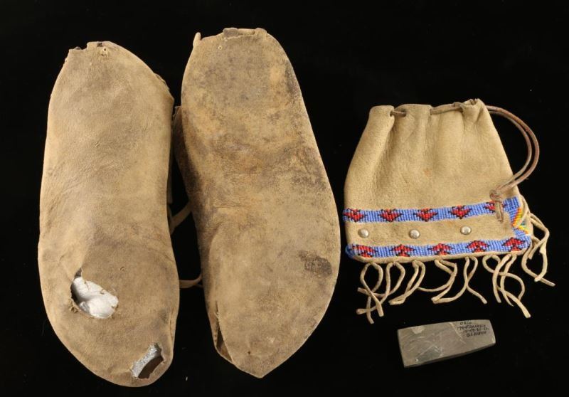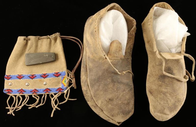 Beaded Strike A Light bag with metal grommets, drawstring and fringed bottom. Pair of plain leather moccasins, one of which has holes on the bottom. Sharpening stone from Ohio area.