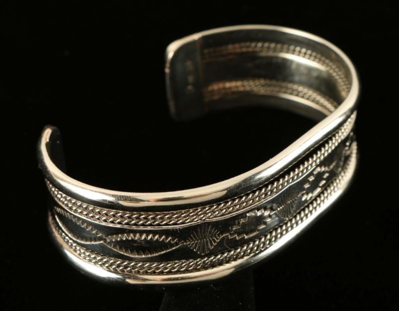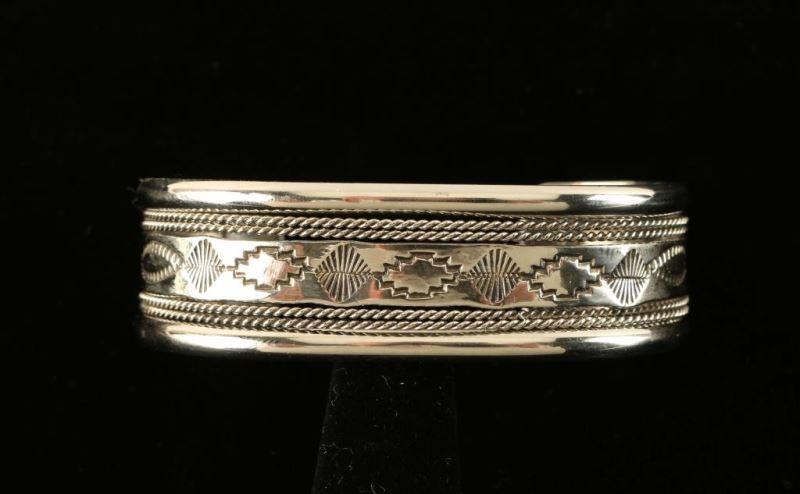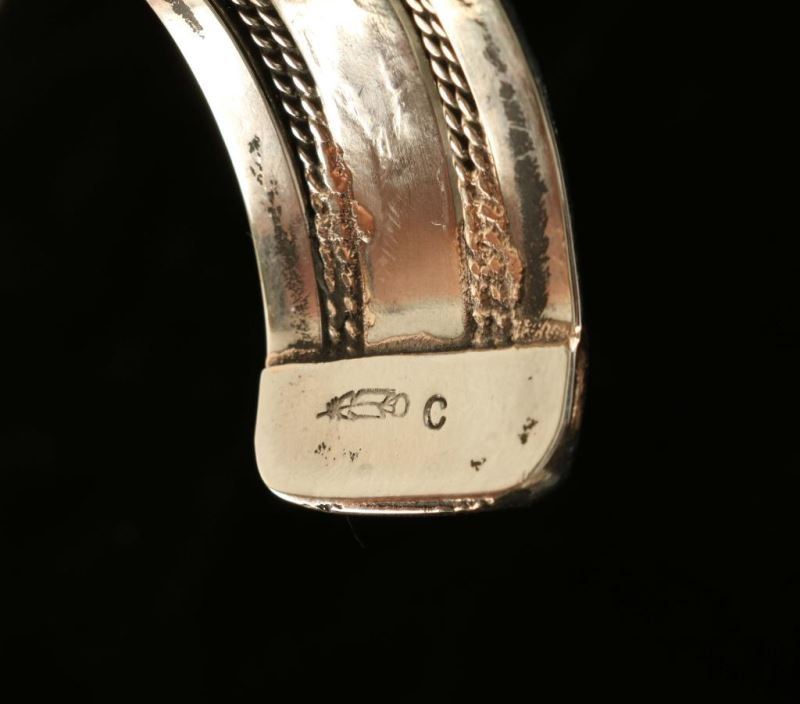 Hammered geometric and twist wire patterns. Measures 3/4" wide by 6 1/4" long plus 1" gap. Unsigned.