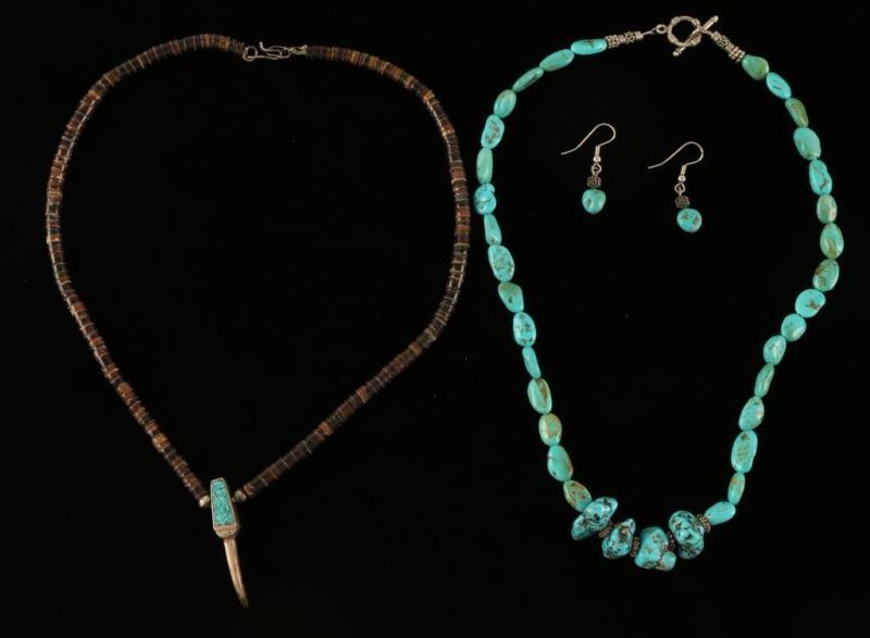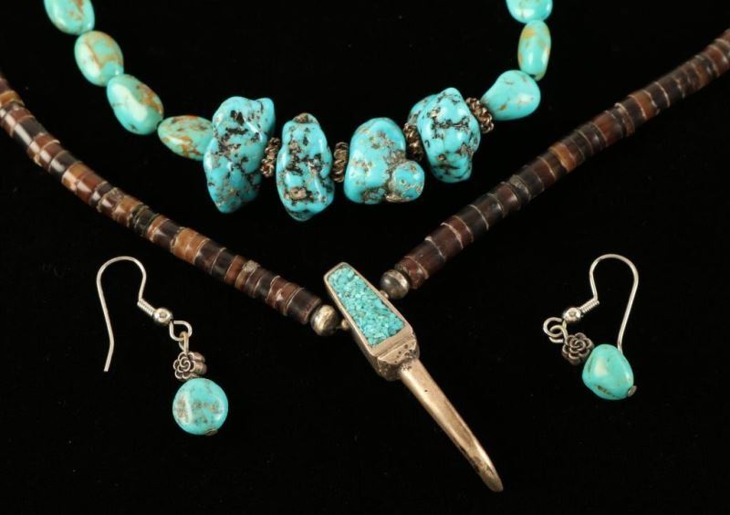 Heishi necklace with a sterling silver claw inlaid with turquoise with a hook and eye closure. Natural stone turquoise necklace with larger stones at the center with matching earrings-pretty blue and green variations.