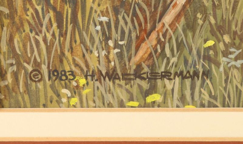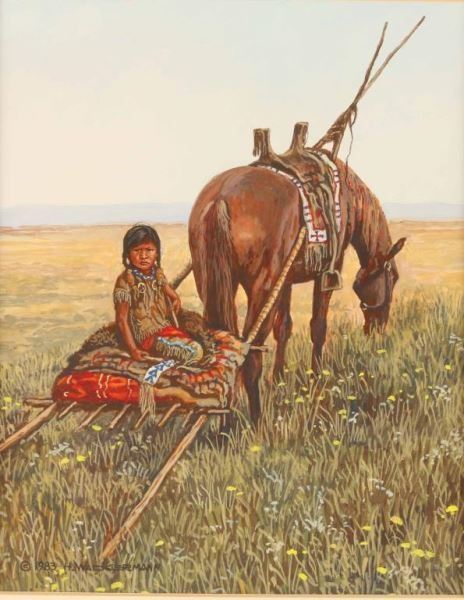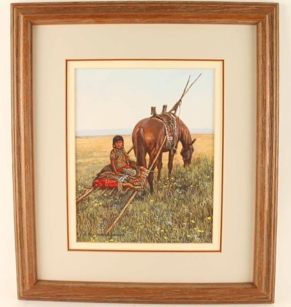 "Little Horse" by H. Wackermann depicting a child and horse with travois. Hand signed lower left dated 1983. Measures 7 1/2"x9 1/2". Though born and educated in West Germany, Hubert Wackermann depicts his favorite subject matter: the North American Indian, his natural surroundings, and relevant wild life. Mr. Wackermann's depiction of the Native Americans is the result of an intimate knowledge of his subject matter through travel, study and living with different tribes through the years. Thus, the prime characteristic of his work is authenticity enhanced by detail and the constantly changing hues of nature's colors. In 1976, Wackermann lived for a year on the Six Nations Iroquois Reservation in Southern Ontario. During this time, he taught art classes to Native American children, and had the opportunity for more in-depth studies. Mr. Wackermann has had shows in West Germany, France, Egypt, and Canada as well as Denver, Colorado, San Diego, California, Albuquerque, New Mexico and most recently at the Booth Museum of Western Art in Cartersville, Georgia to which museum he has recently donated one of his original paintings that hangs as part of the museum's permanent exhibit.