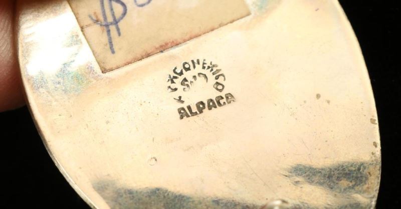 Oval with silver mountain design and abalone in the background. Marked 'Alpaca' on the back measures 2 1/4" wide.
