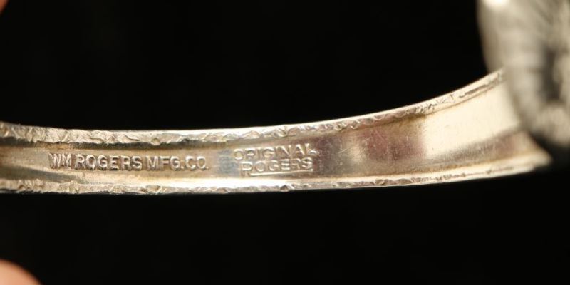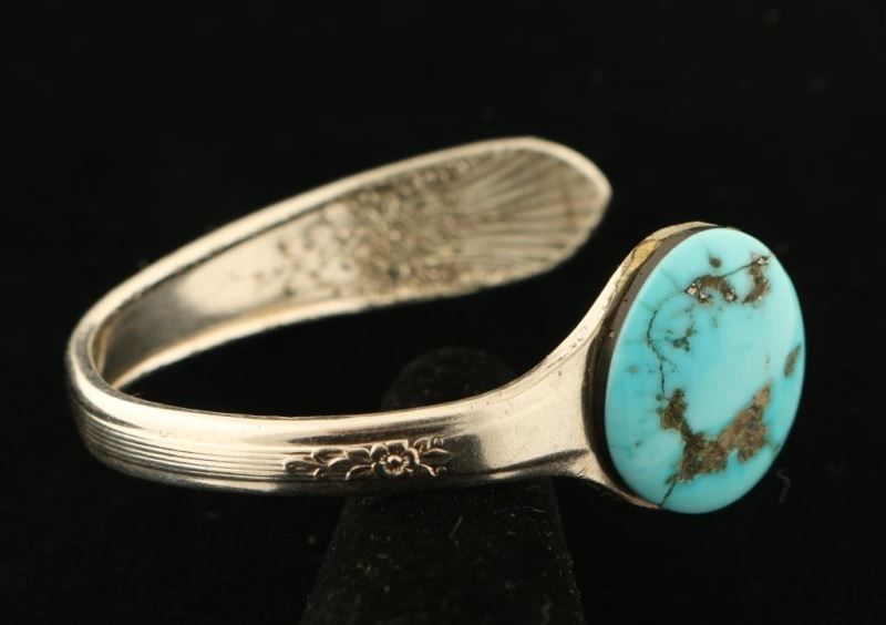 Sterling spoon with floral spray pattern with a large turquoise cab on the other end. Marked 'Wm Rogers Mfg. Co. Original Rogers'.