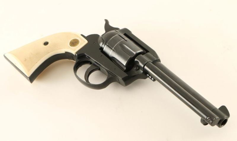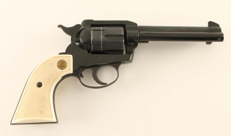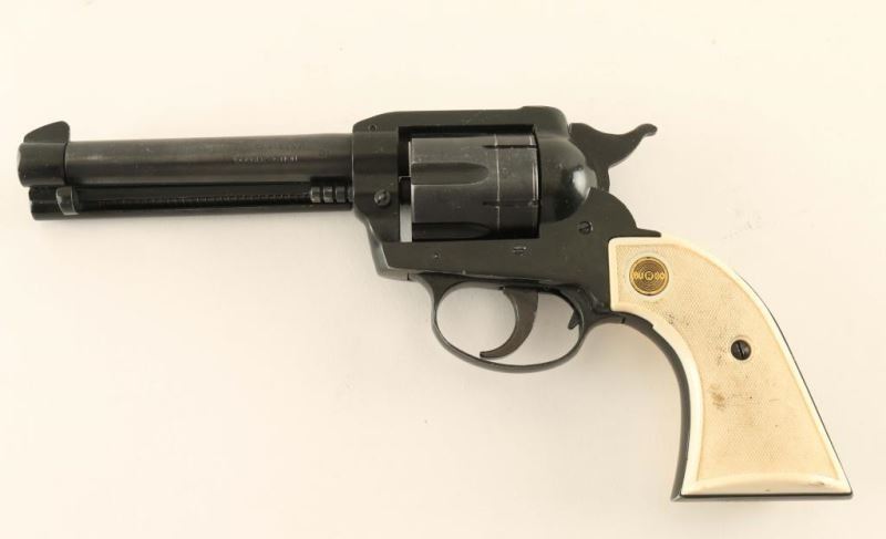 German made single action 6 shot revolver, blued/black finish, 5" barrel, blade front sight, square notched rear sight, fluted cylinder with recessed chambers, ejector rod, serrated hammer spur, alloy frame, smooth trigger, and 2 piece checkered white plastic grips. Approximately 85% finish intact overall, showing edge wear, drag marks on the cylinder, and some scattered scratches. Action performs well with tight lockup, bore is excellent, and plastic grips are good exhibiting some minor blemishes. Condition is good. *Modern Firearm***