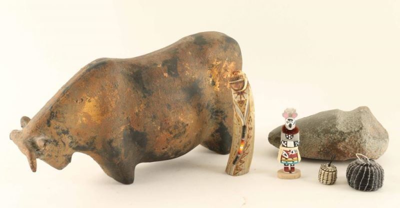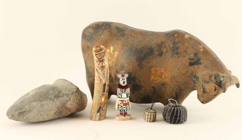 Including cast iron bull with bronze and black patina, stone grinder of unknown age or origin, two mini horsehair baskets, Mouse Kachina, and an antler carving of Maize Mother.