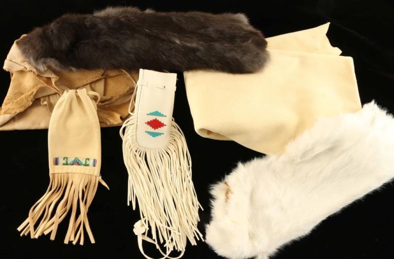 Including; two tanned pieces of leather, one small black and white fur and two medicine bags-one beaded and one painted.