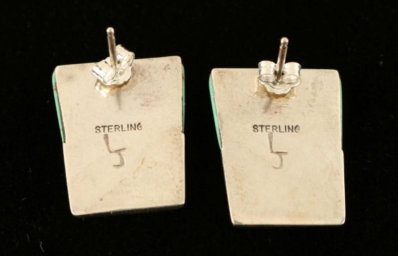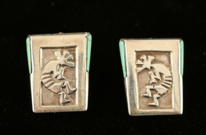 by Navajo artist Leonard Jim depicting Kokopeli in stamp work with turquoise inlay on sides. Signed on back "Sterling LJ conjoined) Measures 7/8"X5/8". Leonard Jim is a contemporary Navajo artist who is noted for mosaic, channel inlay, silver overlay, stamp work, applique jewelry and buffalo dance rattles. His favorite design include kokopeli, horse, pictorial and story teller. He lives in Gallup New Mexico.