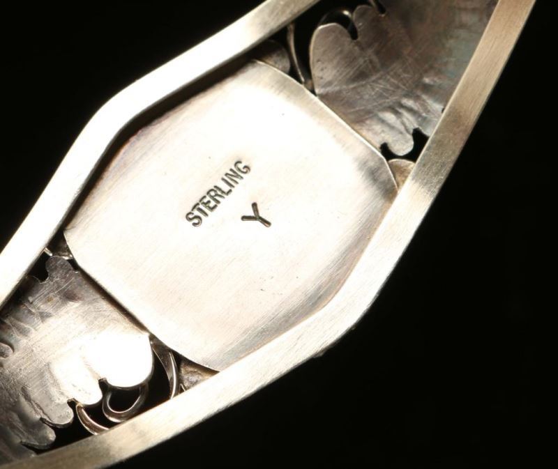 Bracelet with out siding applique work by Navajo artist Celine Yazzie. Signed on back "sterling Y". Cuff measures inside 5 1/4 plus 1 3/8 gap design measures 7/8".