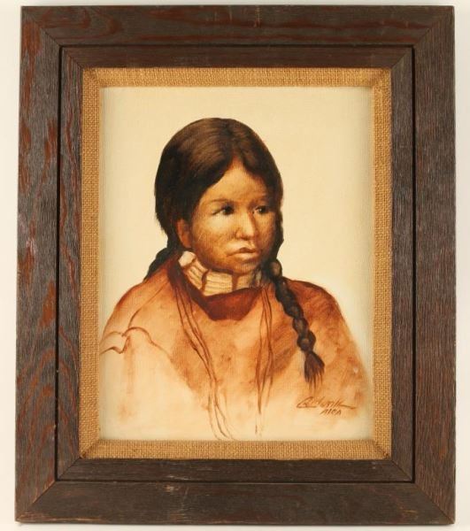 Charles La Monk depicting Sioux Indian child portrait signed lower right in wood frame with fabric inset. Image measures 13 3/4"x10 1/2". Born in Kemmerer, WY on April 22, 1910. LaMonk settled in Palmdale, CA at an early age. He studied at Chouinard Art Institute and privately with Will Foster. He specialized in recording the Indians of Mexico as well as the caves and canyons of the Southwest. He died in Los Angeles on Aug. 9, 1990. Exh: Allied AA (Antelope Valley), 1963.