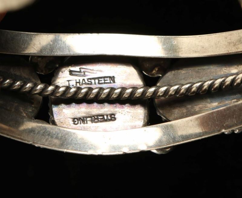 Openwork silver cuff with three turquoise stones, each surrounded by a rope design. Measures 7/8" wide . 5 1/2" long plus a 1" gap. Signed 'Tom Hasteen' and 'Sterling'.