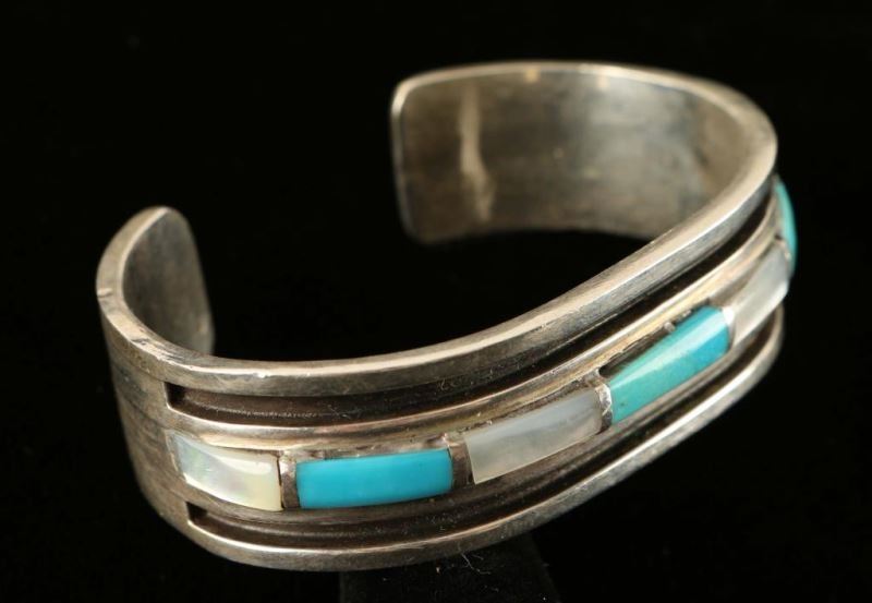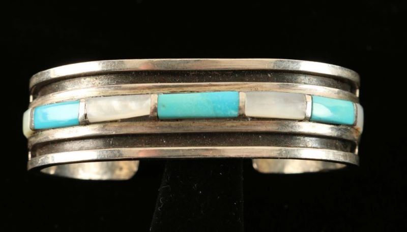 Turquoise and Mother of Pearl inlay and heavy gauge Sterling. Unsigned. Measures 5/8"w x 6"l plus 1" gap.