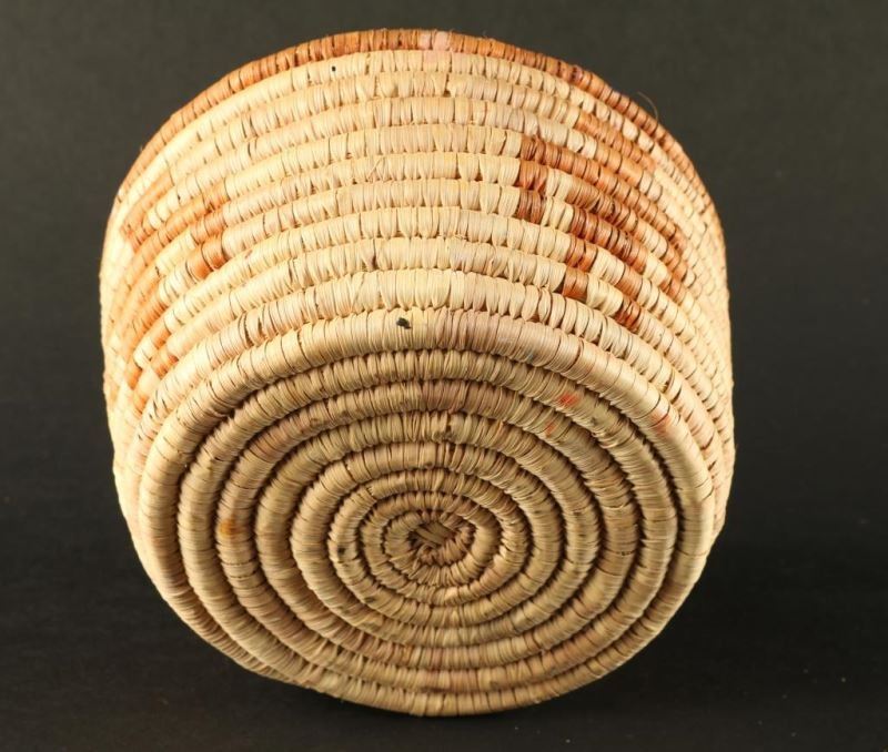 Small basket with burnt orange rim and four figures woven into it. Measures 3 1/4"h x 5 1/2"dia. Good condition.