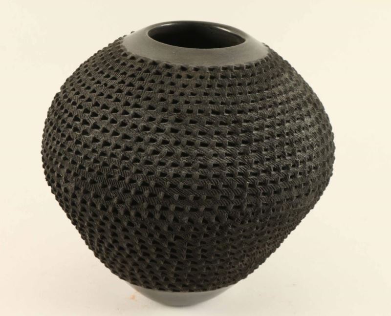 Beautiful basket carved texture throughout surface of pot. Measures 6"h x 5 1/2"dia.