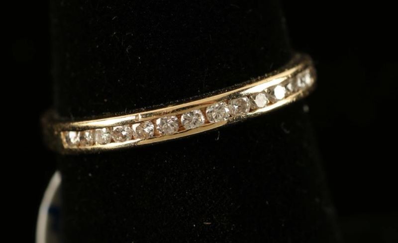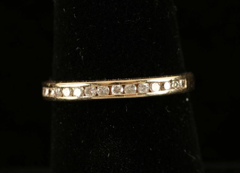 14K gold band inset with tiny round diamonds. Very dainty. Size 6.
