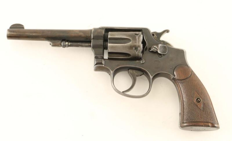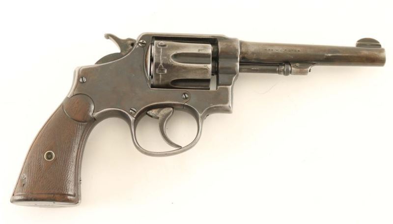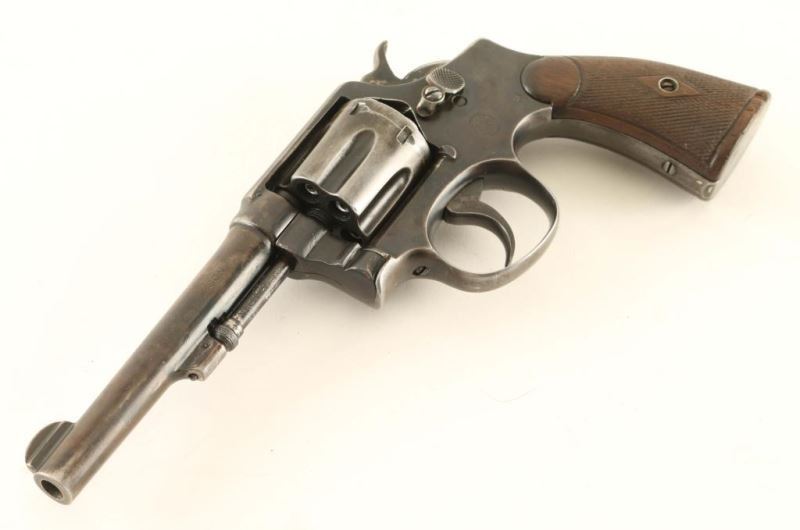 SN: 92811 '4th Change Service Model' Vintage double action revolver chambered in .32 W.C.F, circa 1915-1940. Features a blued finish, pinned 5" barrel with forged round blade front sight, notched rear sight, non-shrouded ejector rod, fluted six-shot cylinder, .265" smooth trigger. checkered .265" hammer spur and two-piece diamond checkered walnut grips. Revolver exhibits approximately 65% of it's blued finish which has dulled & is thinning with losses on the barrel & moderate to heavy holster wear. Action is smooth with mild play in the lock-up, bore is is fair showing pitting and wood grips are near good with worn checkering & small losses. Condition is fair to good. ***C&R Firearm***
