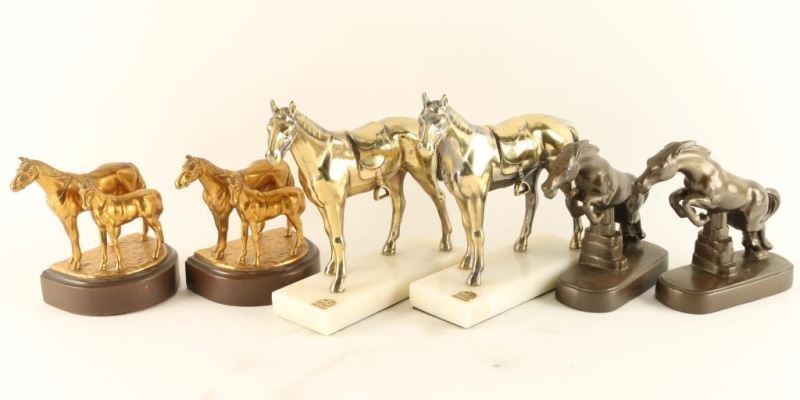 (1) has a brass metal type finish depicting horses with English saddles mounted on a white stone base. (1) Pair of metal bookends with a mare and foal made by The Jennings Bros. Company. (1) Pair of Jumping horse bookends made by the Nuart Company.