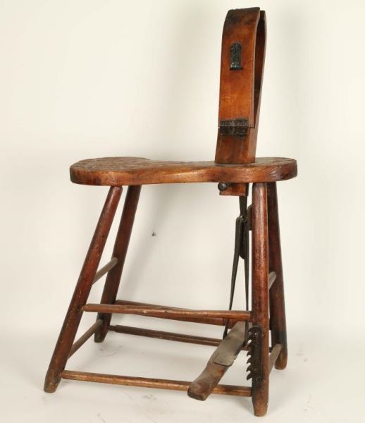 All wood construction with seat and leather strap that works vise. Metal hardware. Measures 42"h x 25"l x 22"w. In working condition. Great nostalgic piece.