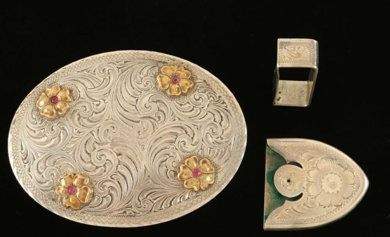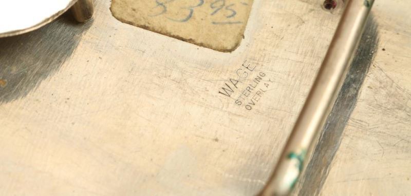 Includes keeper and tip. Silver overlay with a floral motif accented with pink stones. Marked 'Wage'.