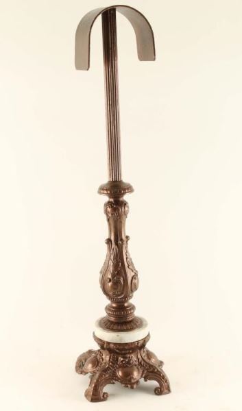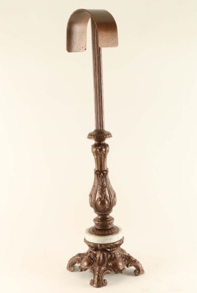 Fancy scrolled bronze metal base with gray and white marble inset holds an arc to set a bridle on. Measures 7"l x 7"w x 31"h. Made by a local Arizona artist.