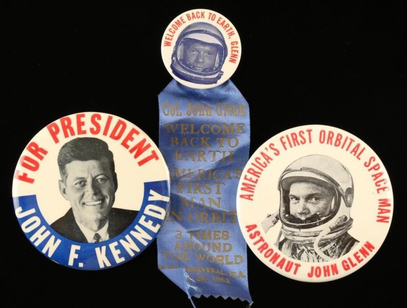 (1) 'For President John F. Kennedy in red, white, and blue with a black and white photo of Kennedy in the center. Measures 3 1/2" dia. (1) 'America's First Orbital Space Man Astronaut John Glenn' in red lettering with a black and white photo of John in his space suit in the center. Measures 3 1/2" dia. (1) 'Welcome Back To Earth, Glenn' red lettering around John's head in an astronaut's helmet 1 3/4" dia. with a blue ribbon underneath that reads "Col. John Glenn Welcome Back to Earth, America's First Man in Orbit, 3 Times Around the World, Cape Canaveral Fla. Feb. 20 1952". Ribbon is 4 7/8" long, good condition.
