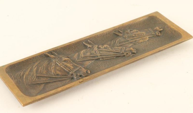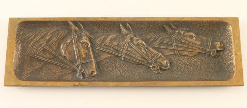 Rectangular tray with a smooth edge that has a molding of 3 horses heads inside. Measures 8 3/8" x 2 5/8". Great for the equine fanatic.