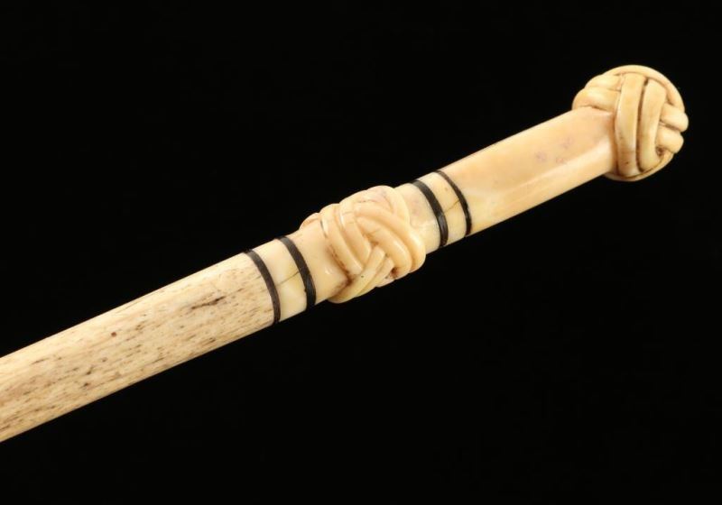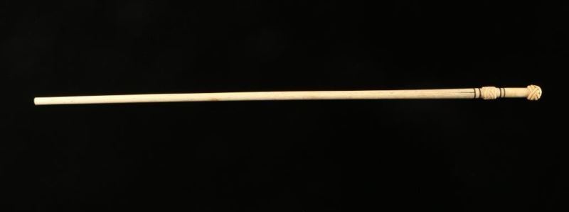 Sculpted braid design for knob and accent at top of cane with alternating scored black lines. Measures 29" long. Two cracks at top of cane otherwise good.