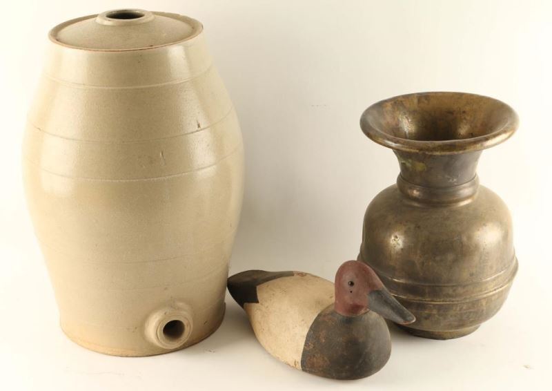 Including: wood decoy, brass spittoon, and a ceramic decanter.