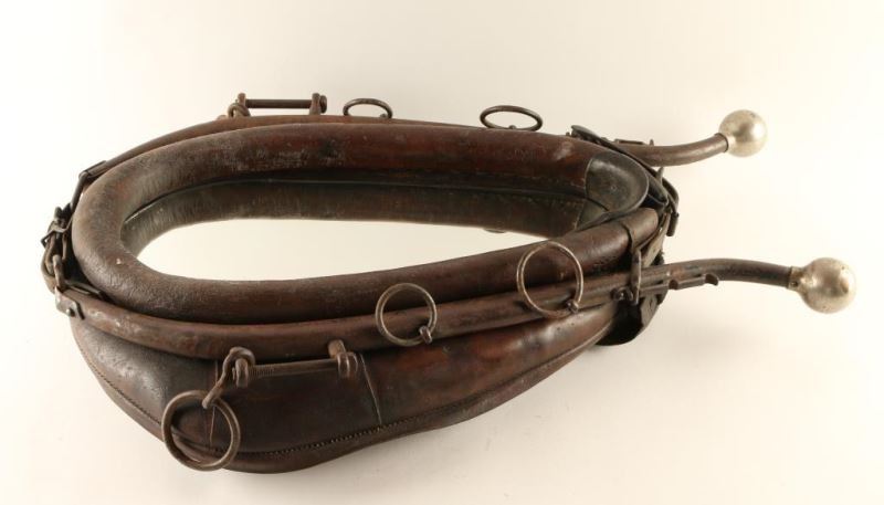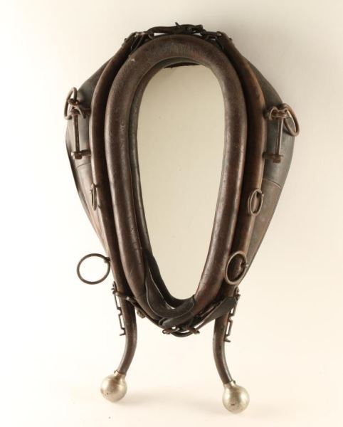 Leather collar with metal hardware hanes that have silver metal knobs with a mirror in the center. Measures 28 1/2"h x 18"w. Great for Western decor.