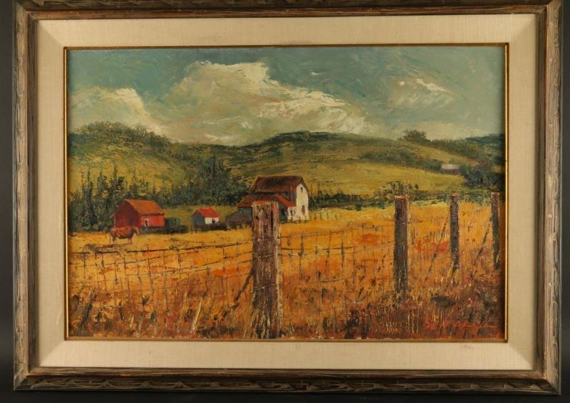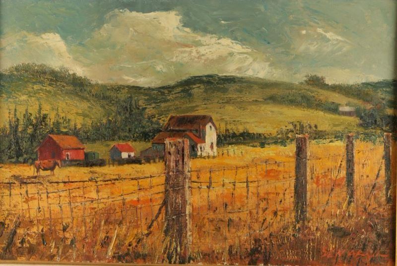 by Ben Avril "Mendicino County" depicting a farm scene. Image size 30" x 19 1/2" .Noted California artist known for painting many California landmarks and also taught painting. Many of Avril's collector's include the US Navy, Pope John Paul and the King of Spain. (1925-1993)