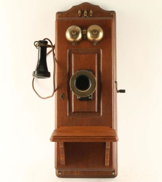 Oak case with brass hardware. Interior phone marked 'Strowger' on dial. Interior mechanism marked 'Stromber's Carlson Company'.