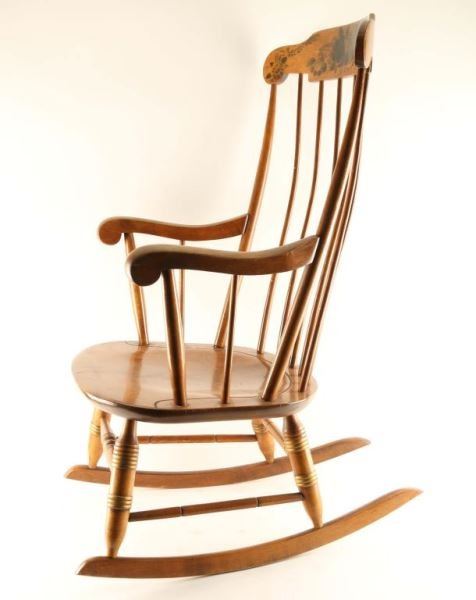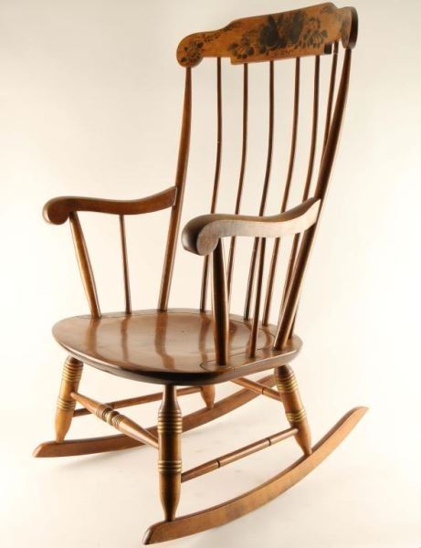 Open back chair with a fruit and floral scene on headrest. Nicely turned legs with a low seat-14" high. Good condition. Measures 41"h x 24"l x 29"w.